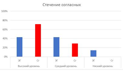 Задание самостоятельно выполнили 43% детей в ЭГ, они показали высокий уровень. Стечения согласных в данной группе дети произносят правильно без призвуков. 43% испытуемых составляют средний уровень, дети выполняют задания с помощью педагога. Стечения согласных произносят правильно и без призвуков только в знакомых словах и при контроле со стороны педагога. 14% не справились с заданиями, они входят в группу детей с низким уровнем. Стечения согласных в этом случае дети не произносят, либо произносят с призвуками.