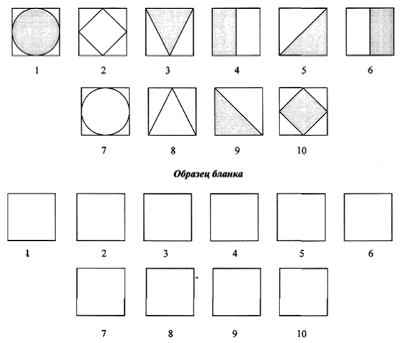 Инструкция. В течение 10с предлагается внимательно рассмотреть фигуры, вписанные в 10 квадратов. По команде нарисовать их в том же порядке.
