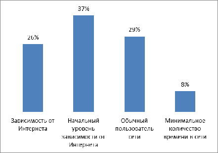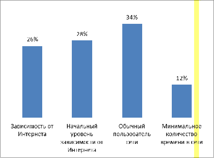 Зависимыми от сети Интернет, по нашим подсчетам, является 26 % данной группы. Интернет вызывает значительные проблемы в их жизни. Им стоит оценить влияние Интернета на их жизнь и немедленно обсудить со специалистом по психическому здоровью проблемы, вызванные их деятельностью как пользователя Интернета.