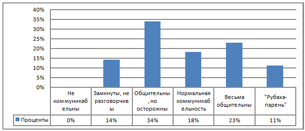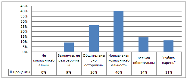 Большая же часть группы - 40 % - относится к людям с нормальной коммуникабельностью. Они любознательны, охотно слушают интересного собеседника, достаточно терпеливы в общении с другими, отстаивают свою точку зрения без вспыльчивости. Без неприятных переживаний идут на встречу с новыми людьми. Но в то же время не любят шумных компаний, экстравагантные выходки и многословие вызывают у них раздражение.