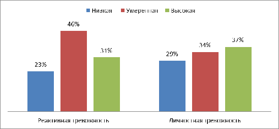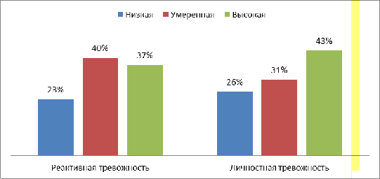 Высокий уровень реактивной тревожности имеет 31 % группы, что характеризуется напряжением, беспокойством, нервозностью. Очень высокая реактивная тревожность может вызывать нарушения внимания, иногда даже нарушение тонкой координации.