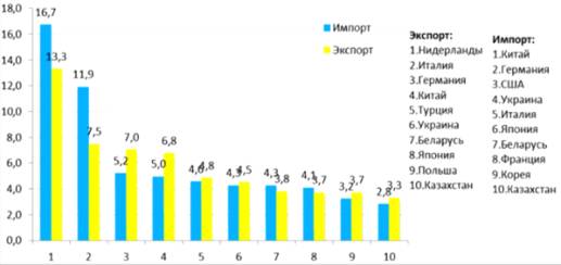 Рис. 1. Крупнейшие торговые партнеры России, в % к общему импорту и экспорту (по данным ФТС, 2013 г.)
