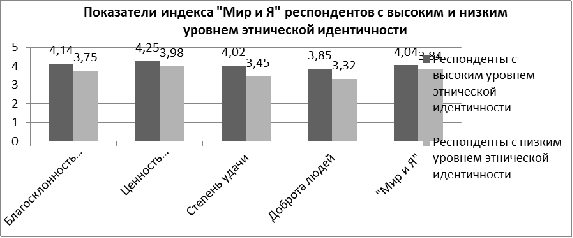 . Респонденты с высоким уровнем этнической идентичности обладают высоким уровнем гармоничности отношений с миром и уверенности в его благосклонности, а также доброте окружающих их людей. Они уверены в собственных способностях к самоконтролю и контролируемости мира, считают, что происходящие в мире события не случайны, строят свою жизнь в соответствии со своими целями и верят в справедливость. Респонденты с низким уровнем этнической идентичности также в большинстве своем считают мир благосклонным, они уверены в своих способностях контроля собственной жизни, но, тем не менее, считают многие происходящие события случайными, жизнь - полной неопределенности, а также проявляют негативное отношение к окружающим людям. Как респонденты с высоким, так и респонденты с низким уровнем этнической идентичности имеют более близкую социальную дистанцию с представителями своей национальности. Социальная дистанция обоих групп респондентов с представителями других национальностей является более далекой.