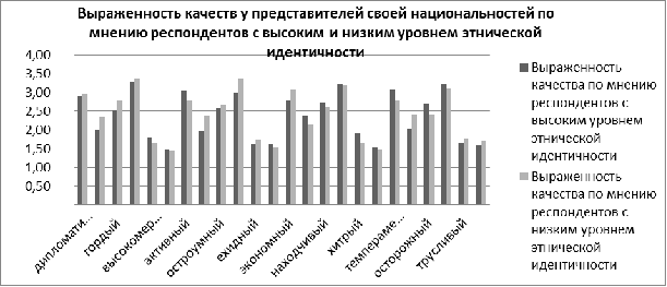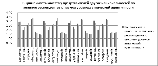 . Респонденты с высоким уровнем этнической идентичности склонны примерно одинаково оценивать как положительные (дипломатичность, общительность, активность, настойчивость), так и негативные (навязчивость, высокомерие, педантичность, агрессивность) качества представителей своей и других национальностей. Они считают, что как представители их собственной, так и представители других национальностей обладают не только положительными, но и отрицательными качествами, но, тем не менее, представители своей национальности оцениваются ими более позитивно. Респонденты с низким уровнем этнической идентичности в большинстве случаев приписывают представителям других национальностей более отрицательные качества (высокомерие, лицемерие, ехидство, упрямство, агрессивность, жадность и трусость). Большая часть положительных качеств, таких, как общительность, покладистость, аккуратность, настойчивость выражены, по их мнению, у представителей своей и других национальностей в равной мере.