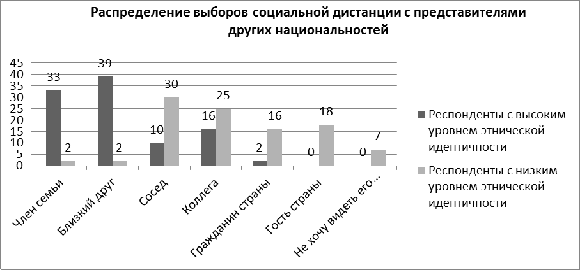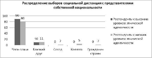 Такие результаты могут быть объяснены тем, что люди, имеющие одну национальность с респондентами, вероятнее всего, кажутся им более знакомыми, надежными и более предпочтительными для построения близких отношений, как представители одной большой группы, отличающиеся от представителей других групп. Подавляющее большинство опрошенных респондентов считают лично для себя возможным и желательным иметь представителя своей национальности в качестве близкого родственника. Возможно, полученные результаты можно объяснить тем, что респонденты с высоким уровнем этнической идентичности готовы максимально близко взаимодействовать с представителями своего этноса, подпуская их в свою личностную зону, в то время как респонденты с низким уровнем этнической идентичности готовы к более отдаленным взаимодействиям со своим этносом.