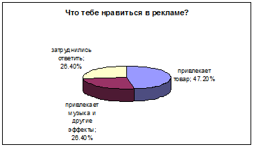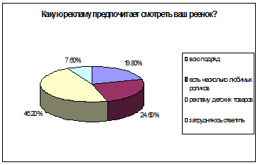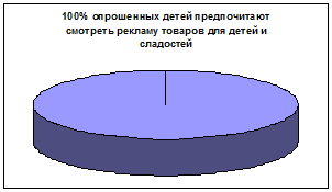 Таким образом, мы видим, что большинство опрошенных детей с удовольствием смотрят рекламу, при этом все дети предпочитают рекламу товаров для детей и рекламу сладостей. Почти половину опрошенных привлекает сам рекламируемый товар. Большинство респондентов доверяет рекламе, и хотели бы, чтоб родители покупали им все рекламируемые товары.