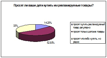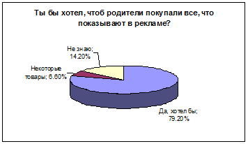 При этом, следует отметить, что 26,4% просили у родителей купить рекламируемые товары (детские игрушки, лакомства); 52,8% опрошенных детей на вопрос «Хотел бы ты, чтоб родители тебе это купили» ответили положительно.