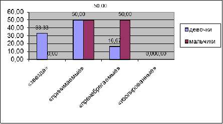 В благоприятном положении (I и II группы) находится (83.35% девочек и 50% мальчиков), что могло бы говорить о благоприятном психологическом климате в группе. Таким образом, этот метод позволяет объективно определять место каждого младшего школьника в системе личных взаимоотношений, которые складываются в группе, что поможет выявить дошкольников, наиболее предпочитаемых сверстниками и оказавшихся в благоприятном положении, с одной стороны, и ребят, которые находятся в своеобразной психологической изоляции, с другой. Такое исследование поможет наметить такие педагогические мероприятия, которые обеспечили бы каждому младшему школьнику благоприятное место в этой системе и повысить степень сплоченности группы в целом.