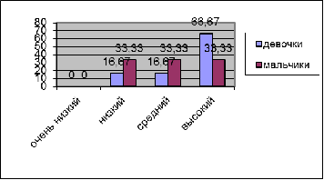 Из таблиц видно, что 66,67% детей имеют высокий уровень развития общительности в группе девочек и 33,33% в группе мальчиков. Эти дошкольники имеют много друзей, они любят бывать на людях, не боятся выступать перед людьми в новой обстановке, открыты, отзывчивы, делятся игрушками со сверстниками, не забывают благодарить за услугу и т.д.