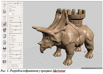 й-скульптинг. 3d-скульптинг він же «цифрова скульптура» являє собою імітацію процесу «ліплення» 3d моделі, тобто деформування її полігональної сітки спеціальними інструментами - кистями [5, с.81]. Можна провести аналогію з ліпленням фігур руками з пластиліну або глини. Тільки в програмах 3d-моделювання пальці замінені на інструмент «кисть», а «пластиліном» є полігональна сітка.