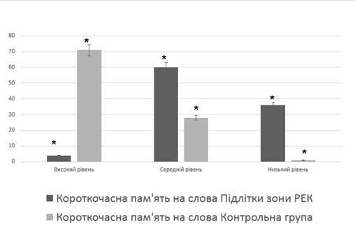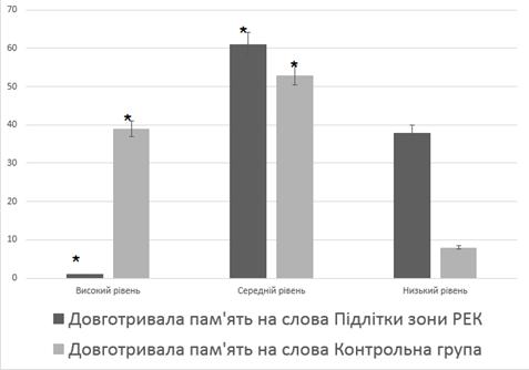 Рис. 3. Відсоткові показники довготривалої пам’яті на слова підлітків зони РЕК порівняно з контрольною групою; * - достовірність різниць (р<0,05).