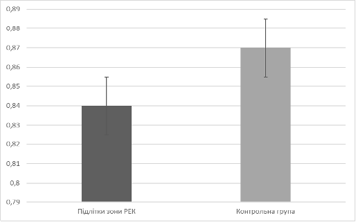 Рис. 6. Коефіцієнт точності підлітків із зони РЕК порівняно з контрольною групою.