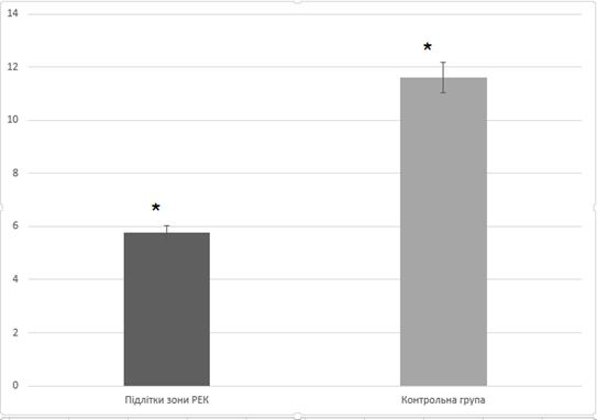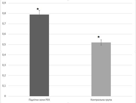 підлітків із зони РЕК, порівняно з контрольною групою; * - p<0,05.