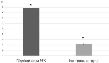 Рис. 9. Показники емоційного напруження підлітків, що проживають в зонах з різним рівнем радіаційного забруднення; p<0,05.