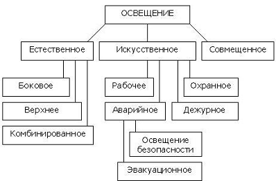 рабочее, аварийное, охранное и дежурное. Для общего искусственного освещения