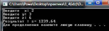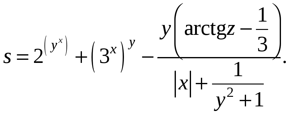 s = pow(2,pow(y,x)) + pow(pow(3, x), y) - (y*(atan(z) - 1 / 3)) / (abs(x) + (1 / pow(y, 2) + 1));