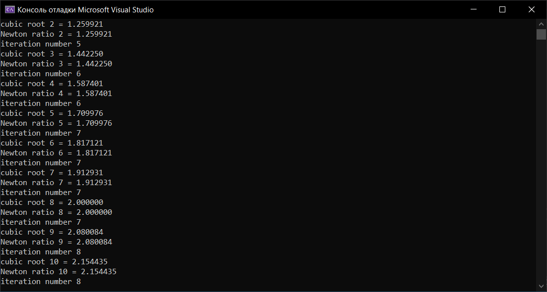 cubic root 2 = 1.259921 Newton ratio 2 = 1.259921 iteration number 5 cubic root 3 = 1.442250 Newton ratio 3 = 1.442250 iteration number 6 cubic root 4 = 1.587401 Newton ratio 4 = 1.587401 iteration number 6 cubic root 5 = 1.709976 Newton ratio 5 = 1.709976 iteration number 7 cubic root 6 = 1.817121 Newton ratio 6 = 1.817121 iteration number 7 cubic root 7 = 1.912931 Newton ratio 7 = 1.912931 iteration number 7 cubic root 8 = 2.000000 Newton ratio 8 = 2.000000 iteration number 7 cubic root 9 = 2.080084 Newton ratio 9 = 2.080084 iteration number 8 cubic root 10 = 2.154435 Newton ratio 10= 2.154435 iteration number 8 |