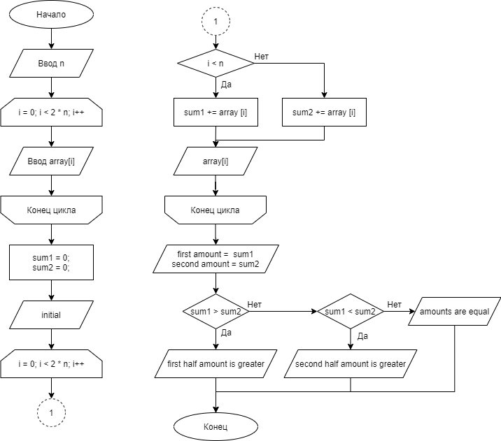Дана последовательность a1,a2,…a2n (n≤15). Получить сумму членов последовательности а1+…+аn, т.е. первой половины последовательности, и сумму an+1+..+a2n, т.е. членов второй ее половины, и сравнить их.