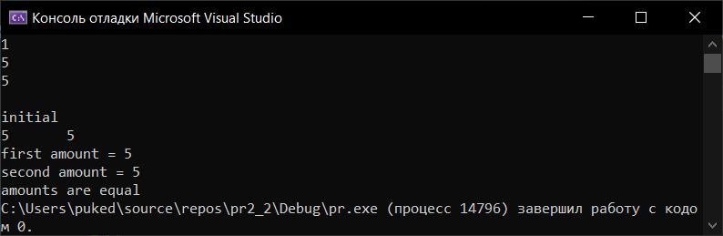 initial 5 5 first amount = 5 second amount = 5 amounts are equal |