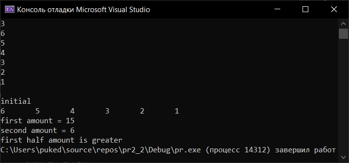 initial 6 5 4 3 2 1 first amount = 15 second amount = 6 first half amount is greater |
