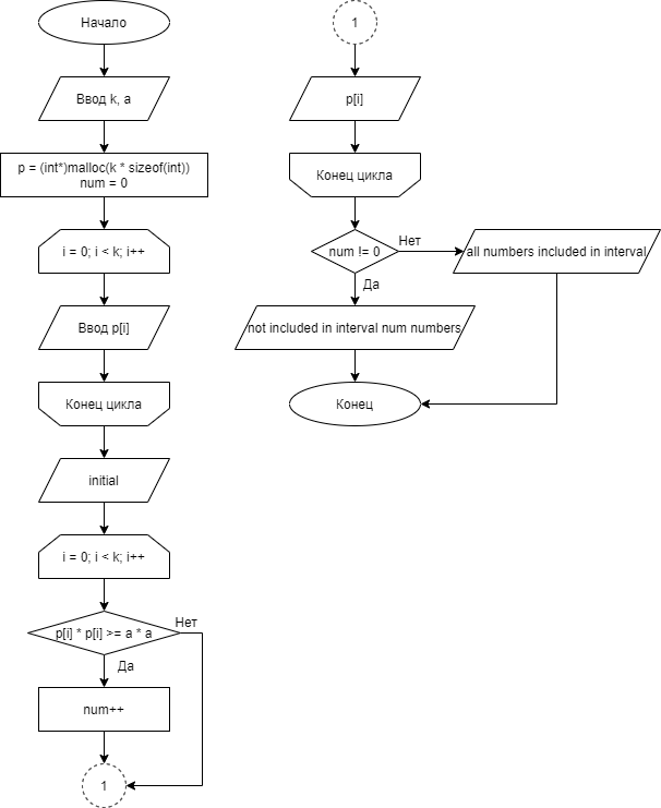 Количество элементов, не лежащих в интервале, обозначим num, тип int.