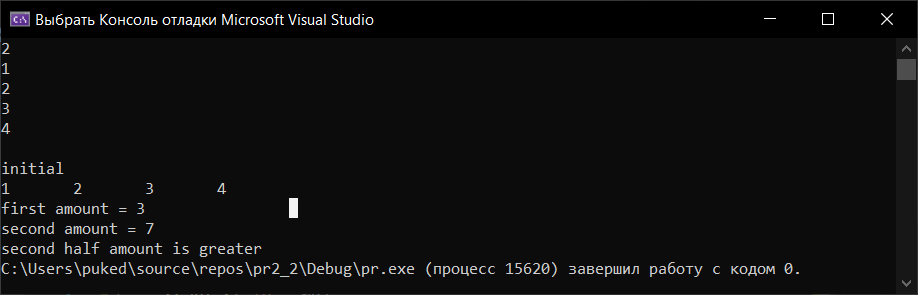 initial 1 2 3 4 first amount = 3 second amount = 7 second half amount is greater |