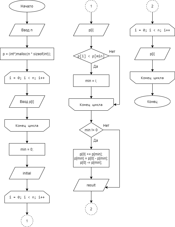 Индекс минимального элемента массива, обозначим min, тип int.