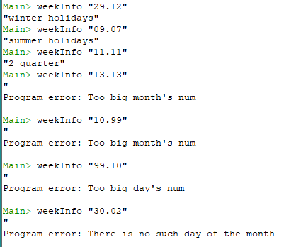 5) Используя функции show, read, error, undefined напишем функцию, которая по введенной дате в формате «dd.mm» выводит сообщение о номере учебной четверти или о виде каникул для школьников. Выводит соответствующие сообщения об ошибках в данных.