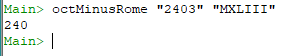 ++ show(octMinusRome "2403" "MXLIII"))