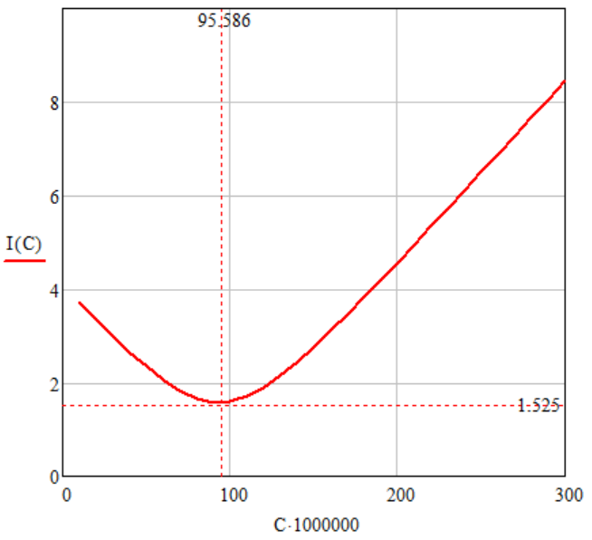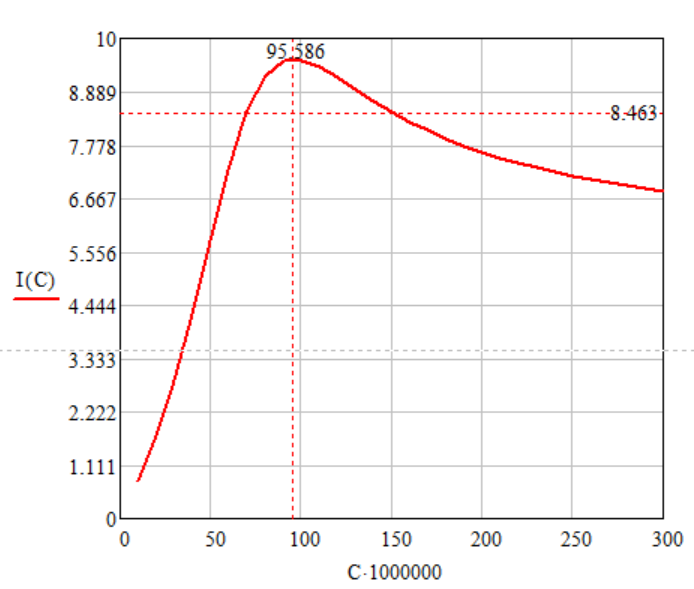 Ток источника (цепи) в зависимости от емкости конденсатора I (C)
