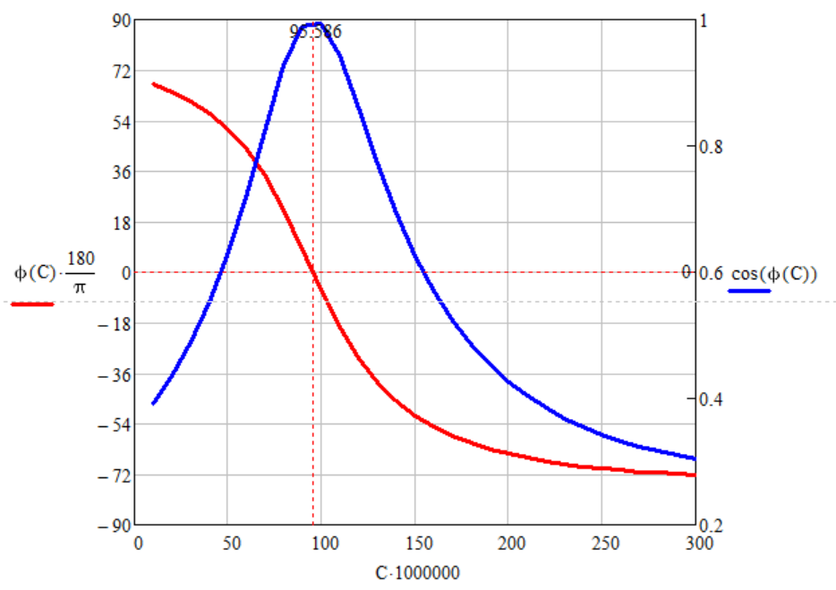 Угол сдвига фазы напряжения от тока и коэффициент мощности в зависимости от емкости конденсатора