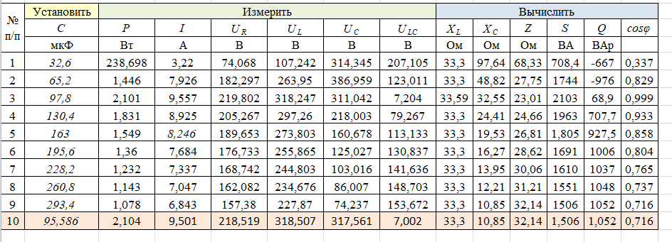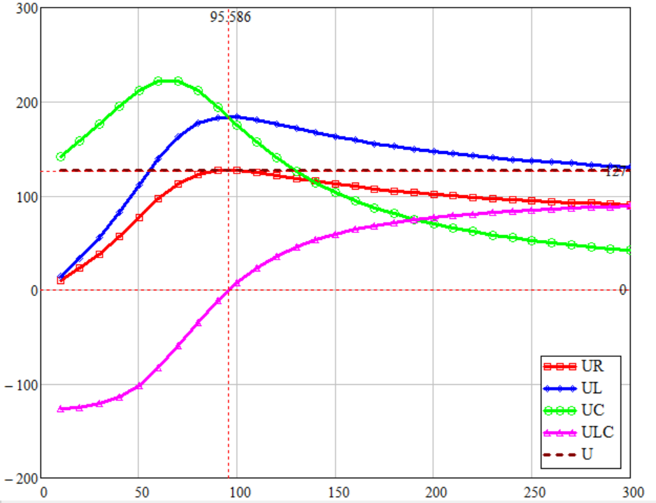 По результатам измерений построить на одном поле графики UR(С), UL(С), UC(С), ULC(С) и отдельно – I(С).