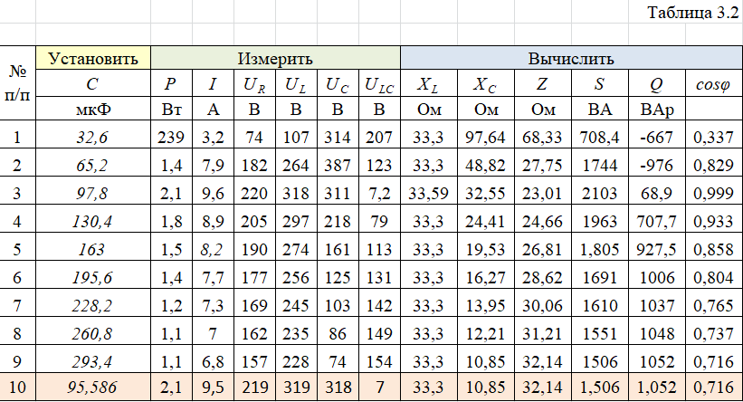 Выполнить исследование последовательного колебательного контура (рис. 3.1) при изменении емкости конденсатора С и заполнить табл. 3.2.