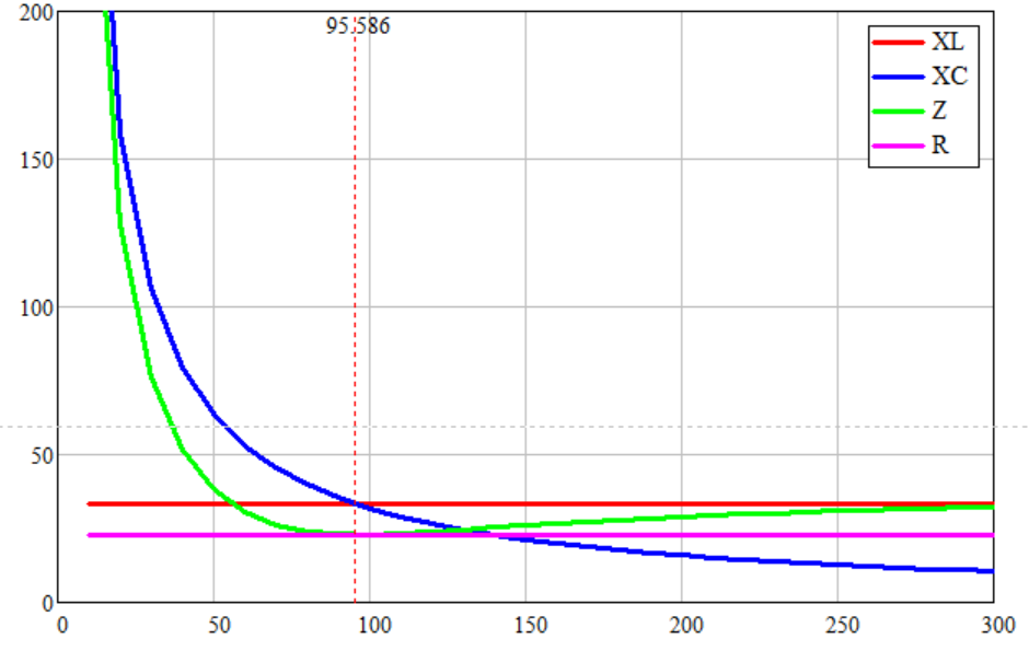 По результатам вычислений построить на одном поле графики XL(С), XC(С), Z(С) и отдельно cosφ(С).