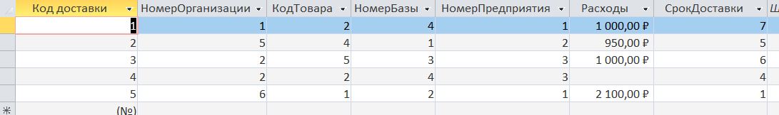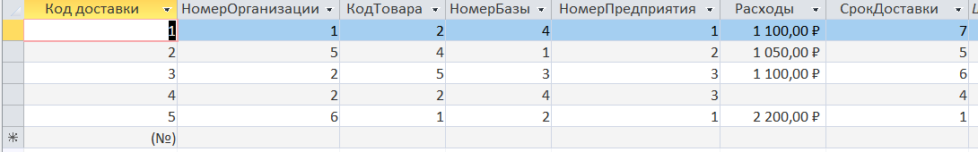 Обновление строк в таблице «Доставка»