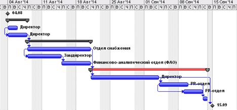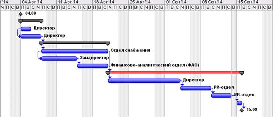 Project выделил красным цветом критический путь проекта, т.е. те задачи, которые определяют его длительность. Также можно сказать, что задачи, лежащие на критическом пути не имеют резервов по началу и окончанию, т.е. любое изменение в начале, окончании, длительности работ лежащих на критическом пути отобразится на сроках всего проекта.