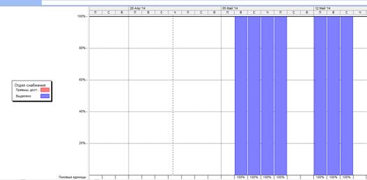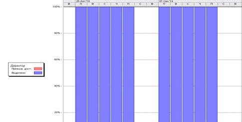 График загруженности ресурса, отображаемый в окне Вид-График ресурсов, представляет собой столбчатую диаграмму, в которой на горизонтальной и на вертикальной осях указывается объем назначений ресурса. Уровень нагрузки ресурса, превышающий установленное для него максимальное значение, выделяется на диаграмме красным цветом. Чтобы вывести на экран график загруженности конкретного ресурса, необходимо: