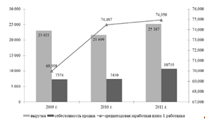 Динамика изменений выручки от продаж, затрат предприятия и среднегодовой заработной платы 1 работника представлена на рис. 4.