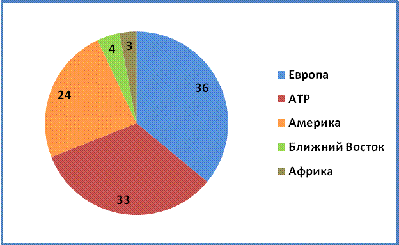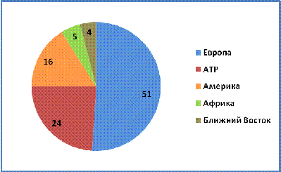 В целом страны АТР в 2015 г. посетило 279 млн туристов (24%). Страны Северной и Южной Америки имеют удельный вес 16% (193 млн человек). Ближний Восток и Африка составляют соответственно 5% (53 млн) и 4% (около 53 млн) (см. рис. 2) [7].