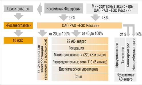 Наиболее сложна структура электроэнергетической отрасли. Доминирующее положение в ней занимает РАО «ЕЭС России» - акционерное общество холдингового типа, контролирующее значительную часть электростанций, межсистемные линии электропередачи, региональные электроснабжающие компании и акционерное общество (АО) «Центральное диспетчерское управление Единой энергетической системы России». В «Основных положениях…» указывается, что статус этой компании неизбежно создает внутренние противоречия ее интересам при переходе к конкурентным отношениям в электроэнергетике. Тем более что преобразование институциональной структуры отрасли осуществлялось далеко не бесконфликтно.