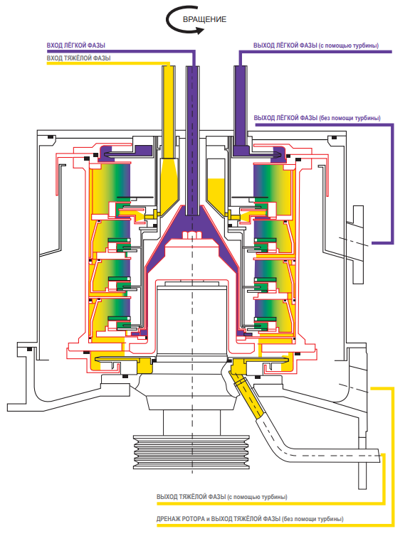 Исходная смесь (тяжёлая фаза, отмеченная жёлтым на схеме), содержащая вещество Х и экстрагент с плотностью, отличной от плотности смеси (лёгкая фаза, отмеченная фиолетовым на схеме), подаются в противотоке на ротор экстрактора.