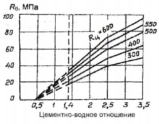 Зависимость R = (Ц/В) представляет довольно сложную кривую, имеющую точку перегиба. На практике эту кривую заменяют двумя прямыми, границей между которыми служит точка Ц/В = 2,5 (В/Ц = 0,4).