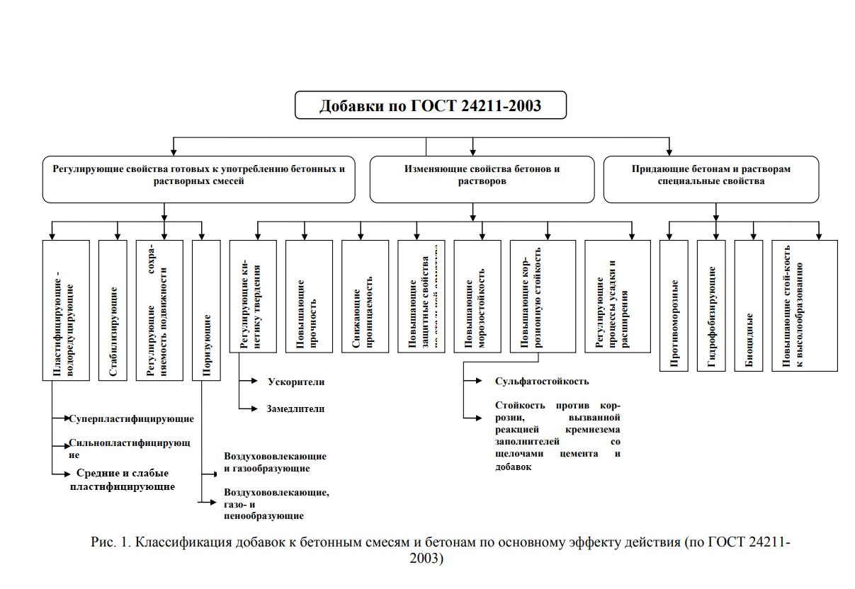 химические – вводимые в бетонные смеси преимущественно в небольшом количестве (0,01 – 2,0% от массы цемента);