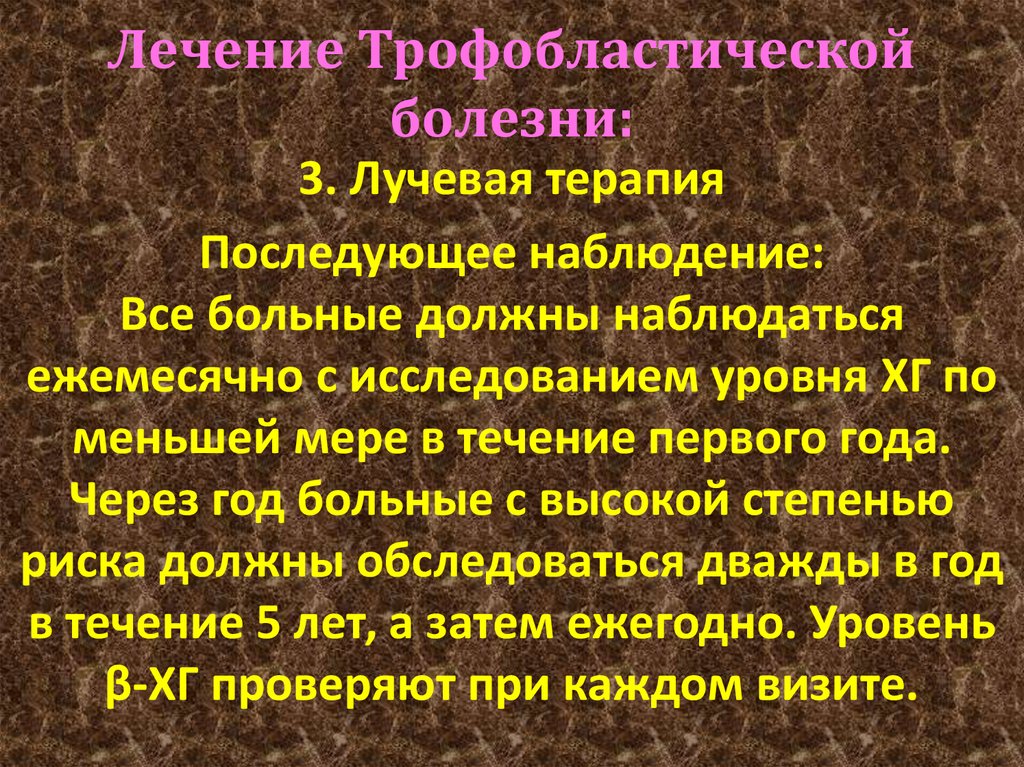 - еженедельное определение концентрации ХГЧ в сыворотке крови до получения трёх последовательных отрицательных результатов, затем - ежемесячно до 6 мес, далее - 1 раз в 2 мес в течение следующих 6 мес;