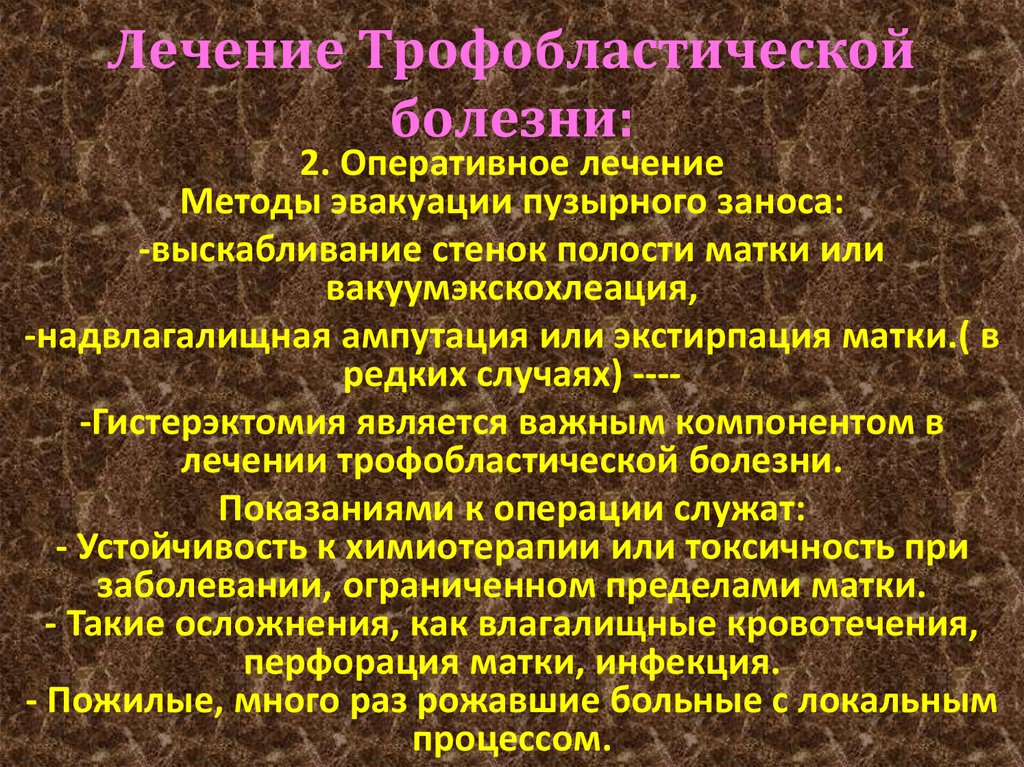 Выскабливание полости матки (осторожно, может быть перфорация матки) с последующим гистологическим исследованием материала. Гистерэктомия проводится только в том случае, если ПЗ деструирующий и есть угроза разрыва стенки матки.