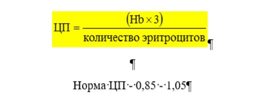Цветовой показатель определяет насыщенность эритроцитов гемоглобином. Вычисляется по формуле: