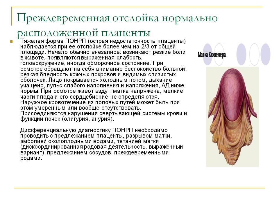 Все эти факторы приводят к нарушению связи между плацентой и стенкой матки, разрыву сосудов с формированием ретроплацентарной гематомы.