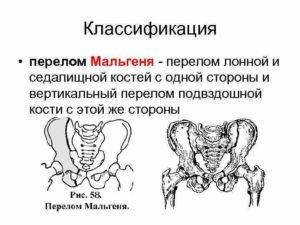 I. краевые 1) отрывные переломы верхней и нижней передних остей подвздошной кости; 2) продольные и поперечные переломы крыла подвздошной кости; 3) переломы крестца в зоне, не участвующей в крестцово-подвздошном сочленении; 4) переломы копчиковых позвонков. II. Переломы костей таза без нарушения непрерывности тазового кольца: 1) односторонний или двусторонний перелом седалищной кости; 2) односторонний или двусторонний перелом одной ветви лобковой кости; 3) перелом ветви лобковой кости с одной стороны и седалищной — с другой. III. Переломы тазового кольца с нарушением непрерывности и разрывы сочленений: А. Переднего отдела: 1) односторонний и двусторонний переломы обеих ветвей лобковой кости; 2) односторонний и двусторонний переломы лобковой и седалищных костей (в форме бабочки); 3) разрывы лобкового симфиза. Б. Заднего отдела: 1) продольный перелом подвздошной кости; 2) разрыв крестцово-подвздошного сустава. В. Полифокальные переломы переднего и заднего отделов тазового кольца: 1) односторонний и двусторонний вертикальный переломы типа Мальгеня; 2) диагональный перелом; 3) различные сочетания переломов костей и разрывы лобкового симфиза и крестцово-подвздошного сустава. IV. Переломы вертлужной впадины: 1 а) перелом крыши; б) перелом дна; в) центральный вывих.