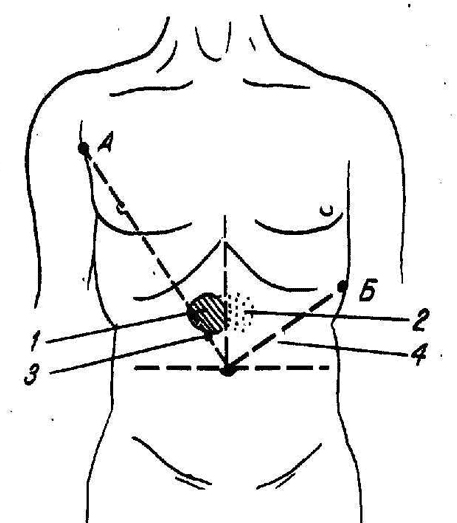 1 - зона Шоффара - между вертикальной линией, проведённой через пупок и биссектрисой угла, образованного вертикальной и горизонтальной линией, проходящей через пупок. Болезненна при воспалении головки ПЖ;
