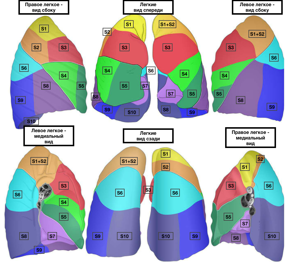 Скелетотопия легких. Передние и задние границы легких почти совпадают с границами плевры. Передняя граница левого легкого, из-за сердечной вырезки, начиная от хряща IV ребра, отклоняется к левой среднеключичной линии. Нижние границы легких соответствуют справа по грудинной, слева по окологрудинной линиям хрящу VI ребра, по среднеключичной линии - верхнему краю VII ребра, по передней подмышечной линии - нижнему краю VII ребра, по средней подмышечной линии -VIII ребру, по лопаточной линии - X ребру, по околопозвоночной линии - XI ребру. При вдохе граница легкого опускается. 2. Сегменты легкого Сегменты - участки легочной ткани, вентилируемые сегментарным бронхом и отделенные от соседних сегментов соединительной тканью. Каждое легкое состоит из 10 сегментов. Правое легкое: верхняя доля - верхушечный, задний, передний сегменты средняя доля - латеральный, медиальный сегменты нижняя доля - верхушечный, медиальный базальный, передний базальный, латеральный базальный, задний базальный сегменты. Левое легкое: верхняя доля - два верхушечно-задних, передний, верхний язычковый, нижний язычковый; нижняя доля - верхушечный, медиально-базальный, передний базальный, латеральный базальный, задний базальный сегменты. На внутренней поверхности легкого расположены ворота.